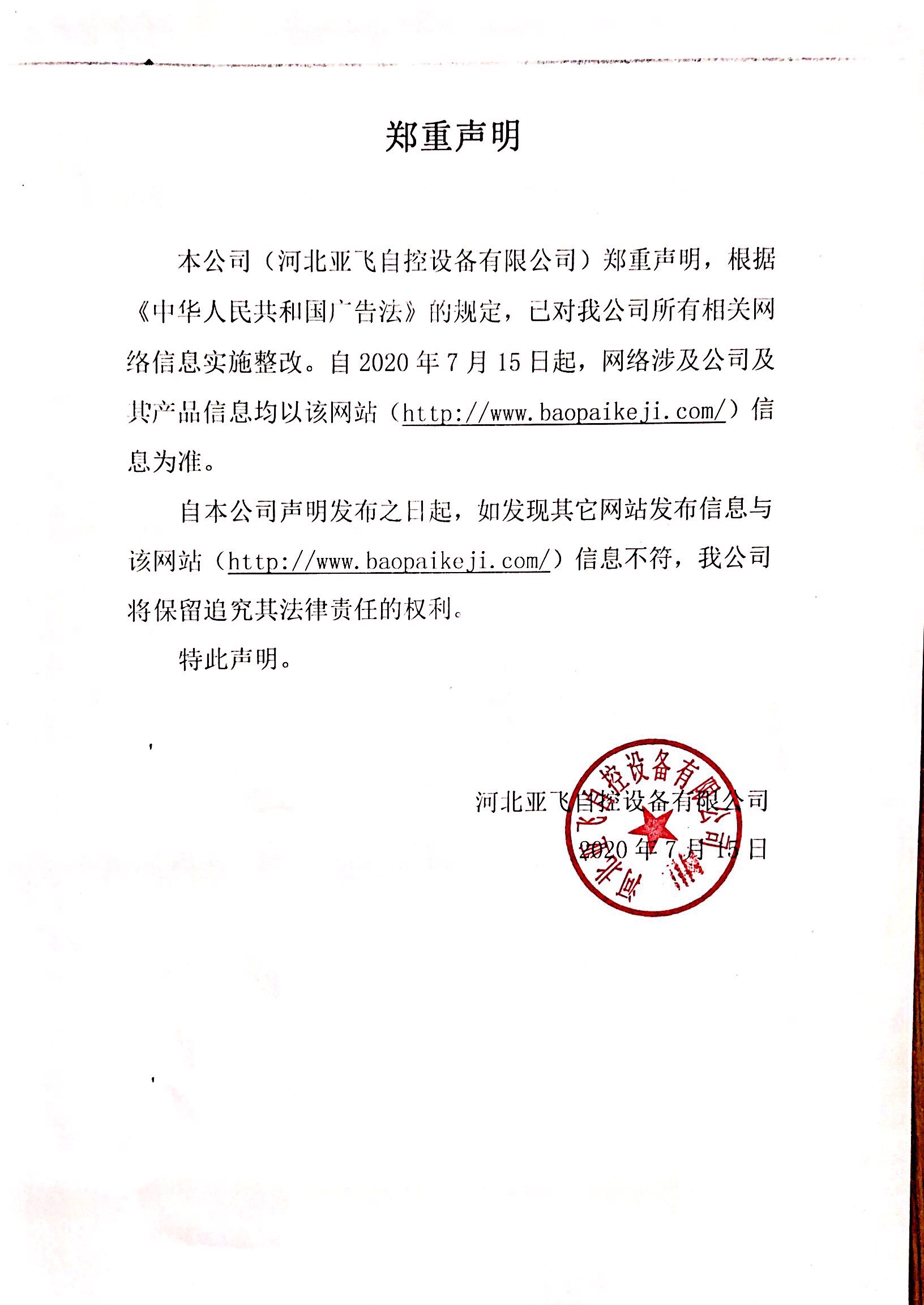 本公司(河北亞飛自控設備有限公司)鄭重聲明,根據《中華人民共和國廣告法》的規定,已對我公司所有相關網絡信息實施整改。自2020年7月15日起,網絡涉及公司及其產品信息均以該網站(http://www.baopaikeji.com/)信息為準。